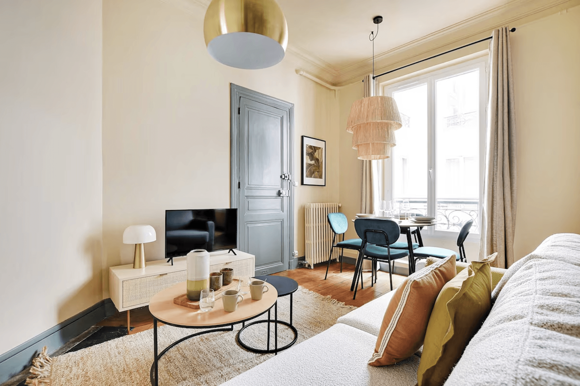 La pièce de vie s’organise autour d’un confortable canapé clair, mis en valeur par une grande fresque tropicale qui transforme le mur en paysage luxuriant. Les chaises bleu‑vert, la suspension en fibres naturelles et les accessoires en céramique apportent des touches de couleur et de matières qui renforcent l’esprit jungle chic. À côté de la fenêtre, le coin repas invite à partager un dîner ou un petit‑déjeuner baigné de lumière naturelle, avec vue sur l’extérieur. L’ensemble compose un cocon chaleureux, à la fois graphique et apaisant, parfait pour s’évader tout en restant au cœur de la ville.